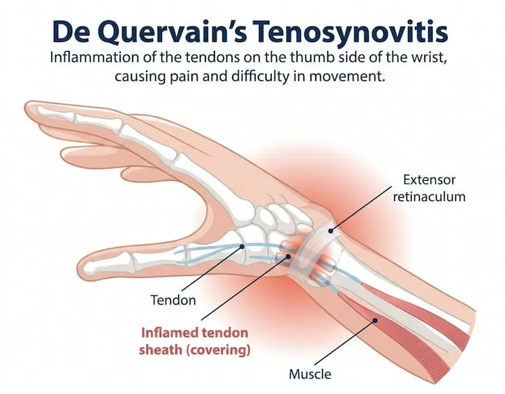 The type most commonly affecting the thumb is De Quervain’s tenosynovitis, a condition involving inflammation of the tendon sheath at the base of the thumb. It affects two thumb tendons—the abductor pollicis longus (APL) and extensor pollicis brevis (EPB)—as they pass through a tight sheath near the thumb base. Repetitive actions such as gripping, texting, lifting, or frequent smartphone use can irritate this area, leading to pain, swelling, and difficulty moving the thumb. This is why many cases described as “thumb tendinitis” are actually tenosynovitis, and often require more than rest alone.