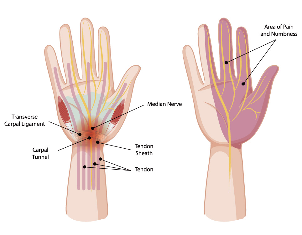 CTS develops when the median nerve is compressed within the carpal tunnel.