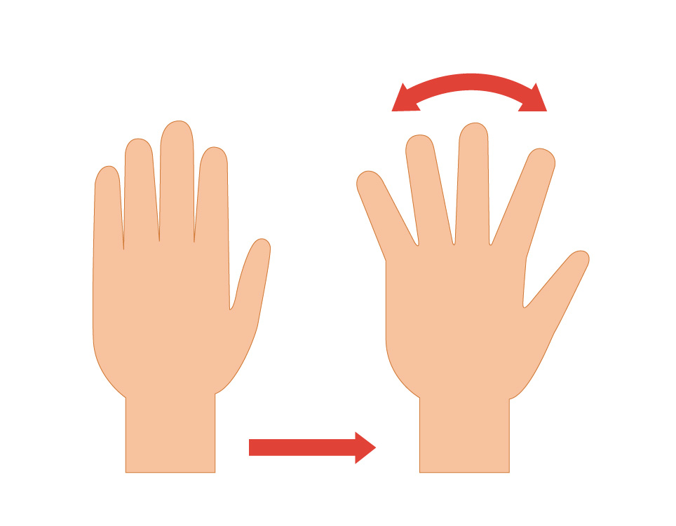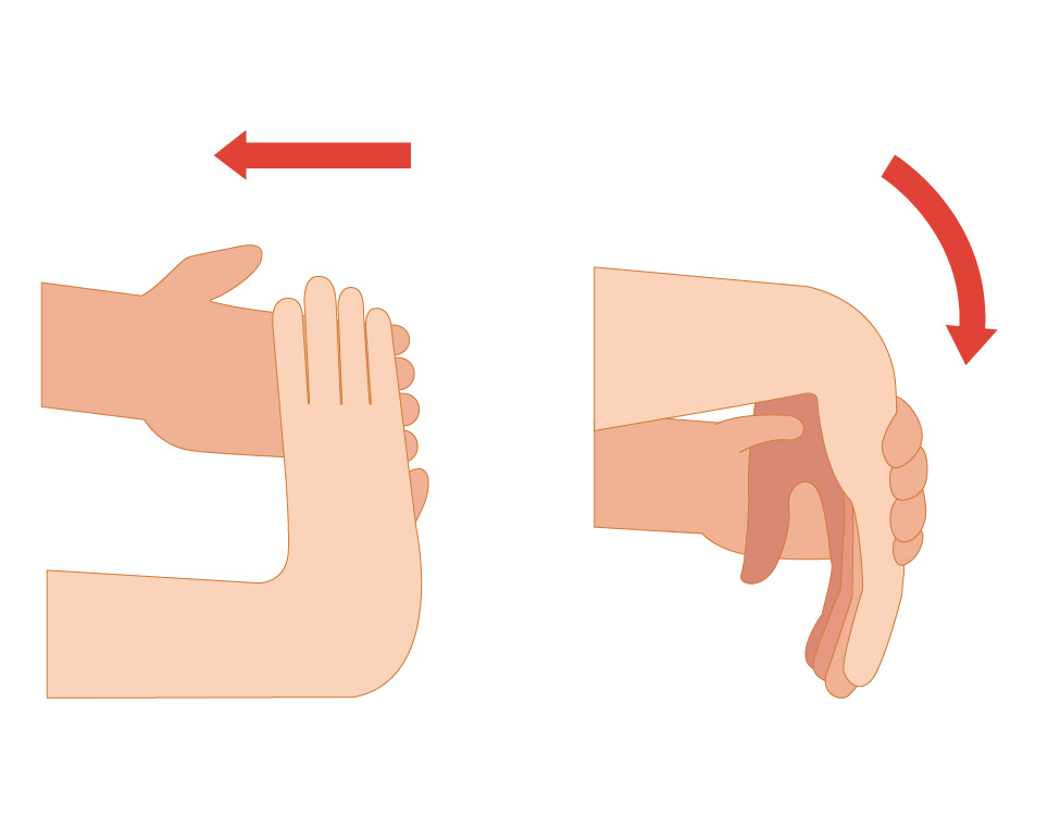 Extend your arm with the palm facing down. Gently push your fingers down and toward the body.