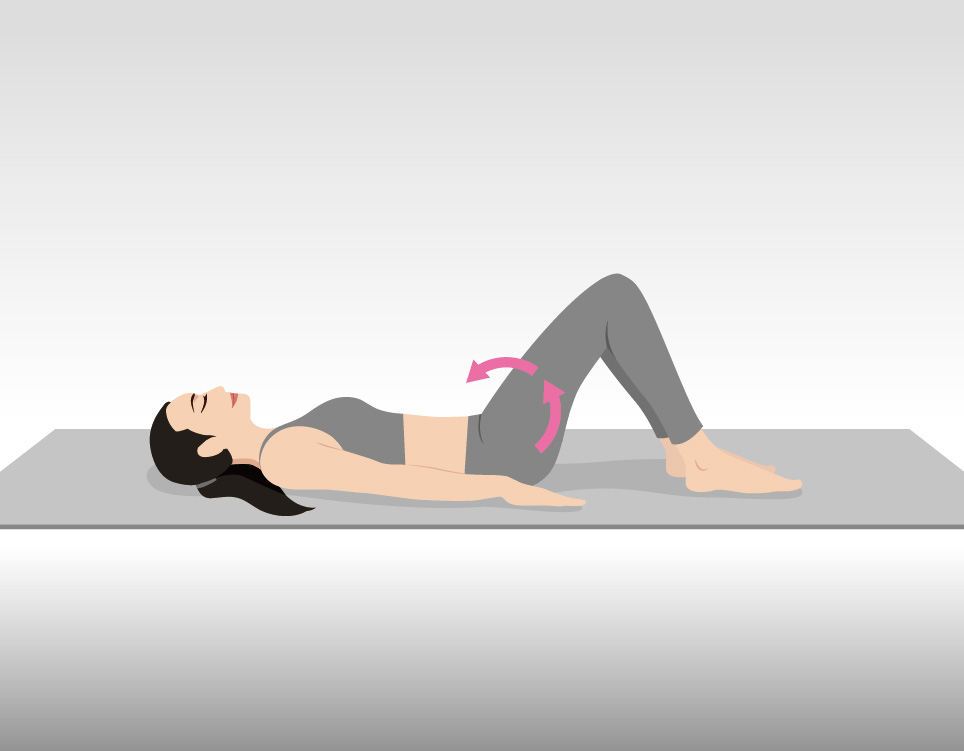 Lie on your back with knees bent and feet flat. Tighten your abdominal muscles and press your lower back gently into the floor. Hold for 5 seconds, then relax.