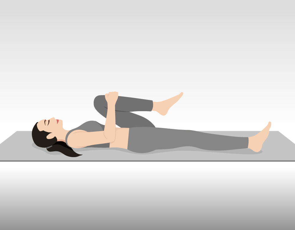Lie on your back with knees bent. Gently pull one knee toward your chest while keeping the other foot flat on the floor. Hold for 15–30 seconds, then switch legs.