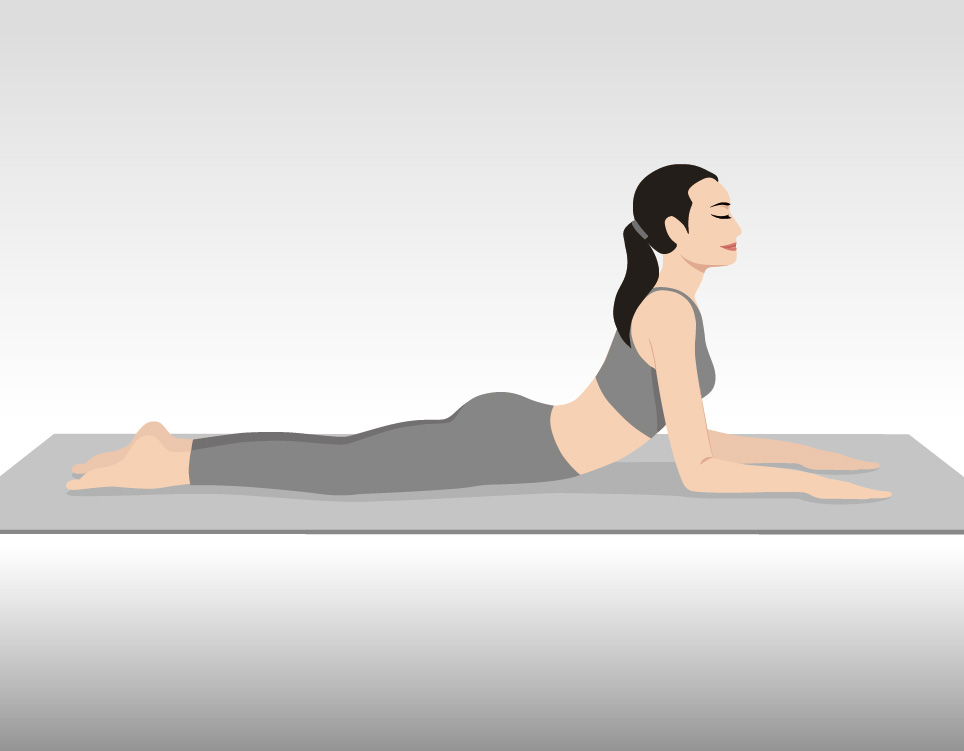 Lie face down, hands under your shoulders. Slowly press your upper body upward, keeping your hips and legs on the floor. Do not force the movement into pain. Hold for 1–2 seconds, then return.
